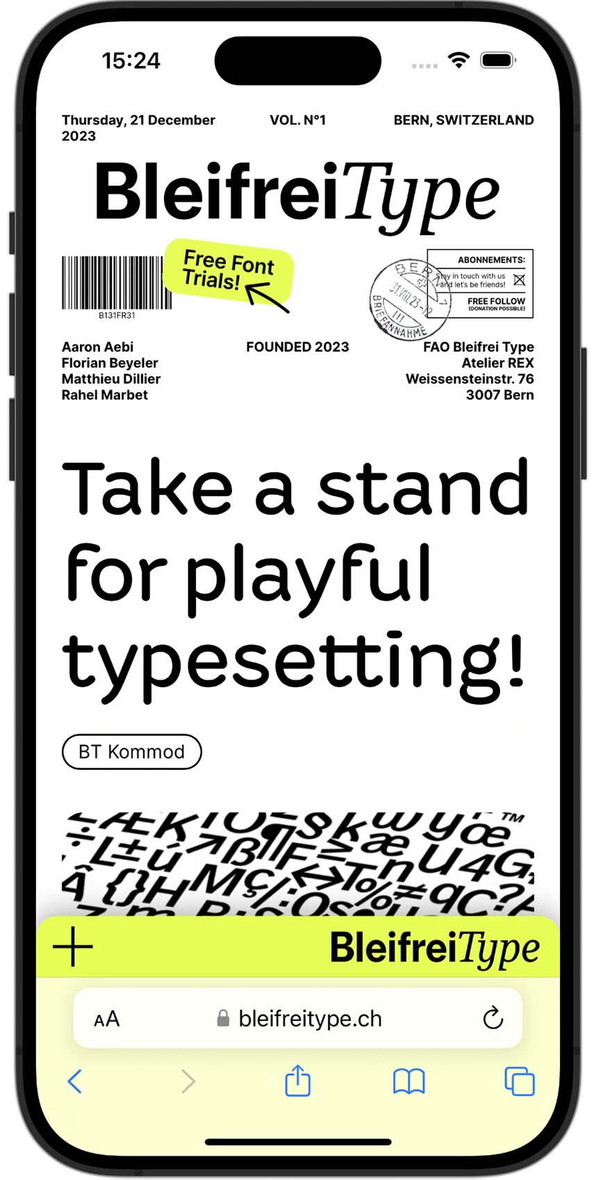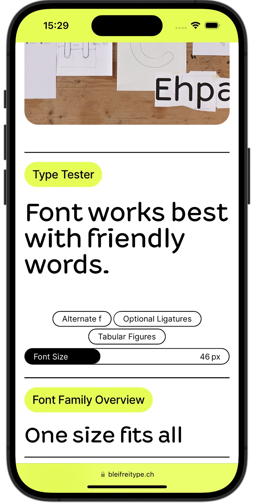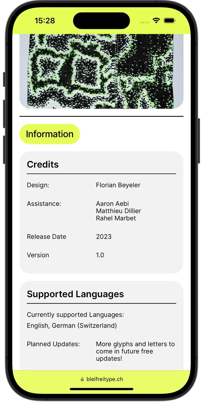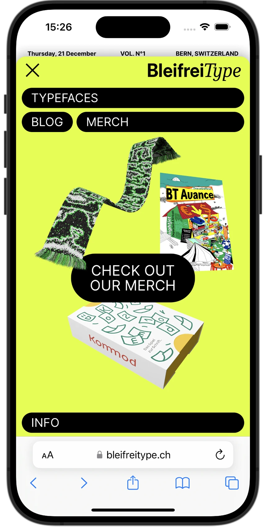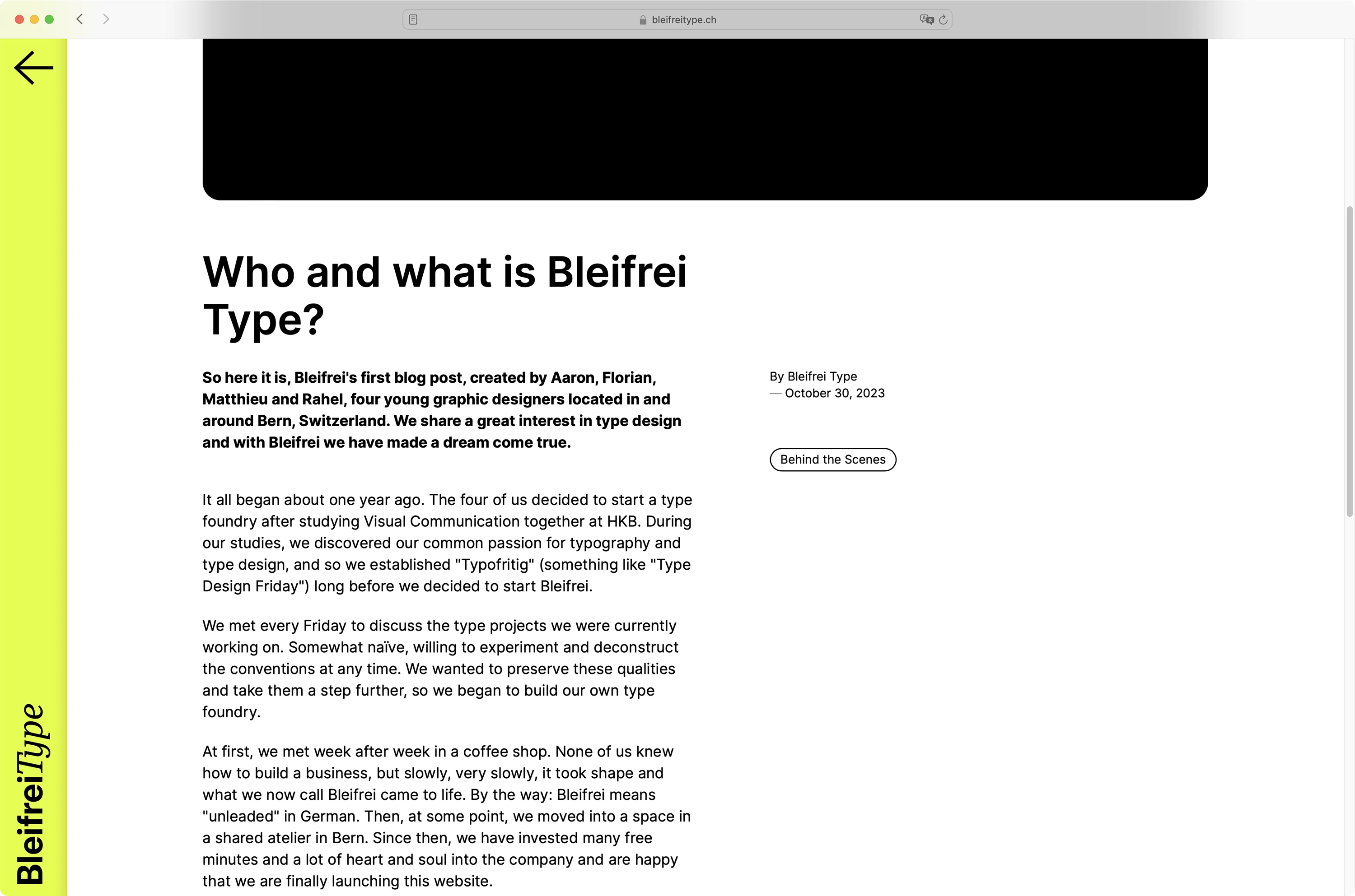 Webauftritt von Bleifrei Type, einer Type Foundry, die ich mit drei Kolleg*innen zusammen am Aufbauen bin. Auf der Webseite werden unsere Schriften präsentiert, können mit einem «Type Tester» getestet und gekauft werden. Das Design ist in Zusammenarbeit mit Aaron Aebi, Matthieu Dillier & Rahel Marbet entstanden. Die Umsetzung in Webflow habe ich übernommen.