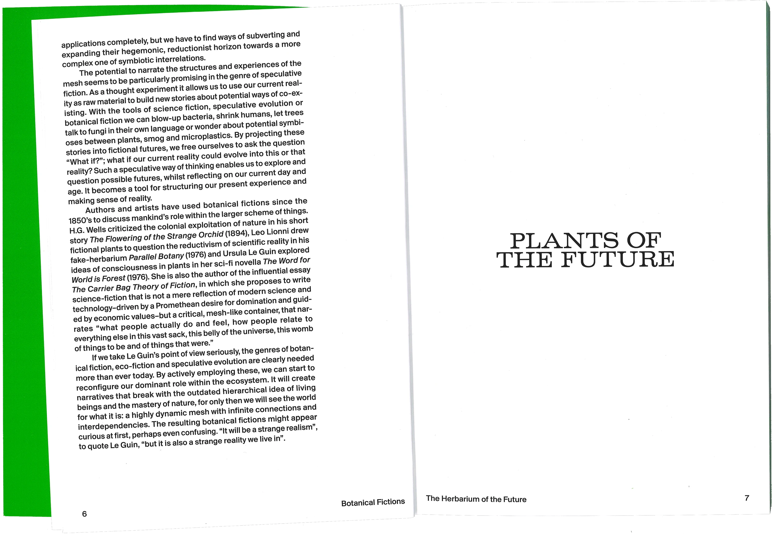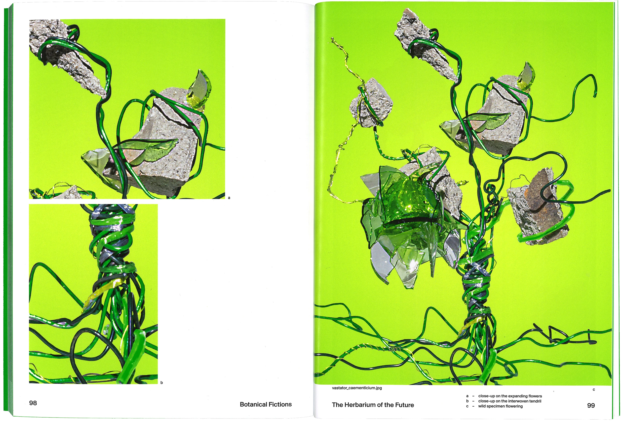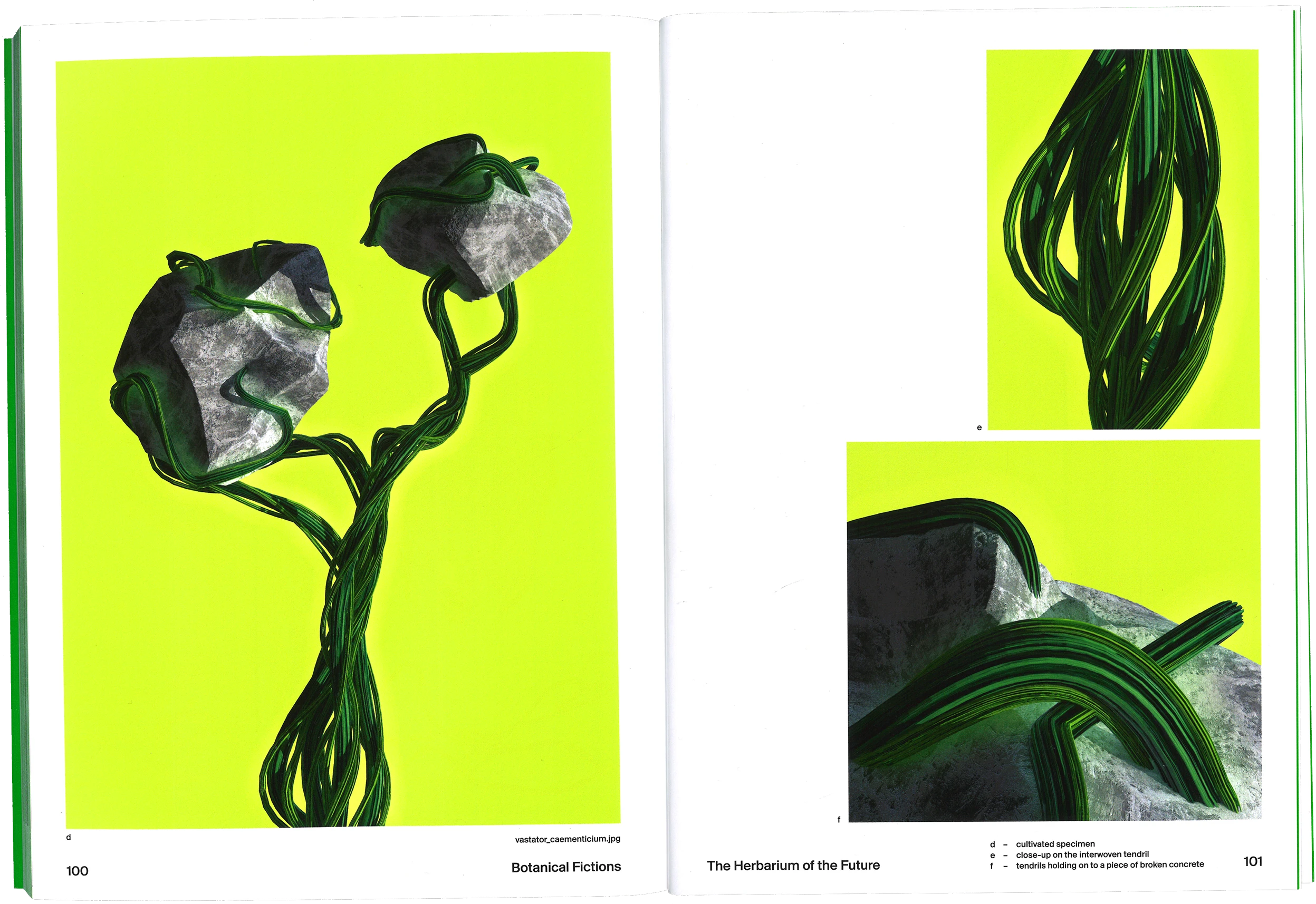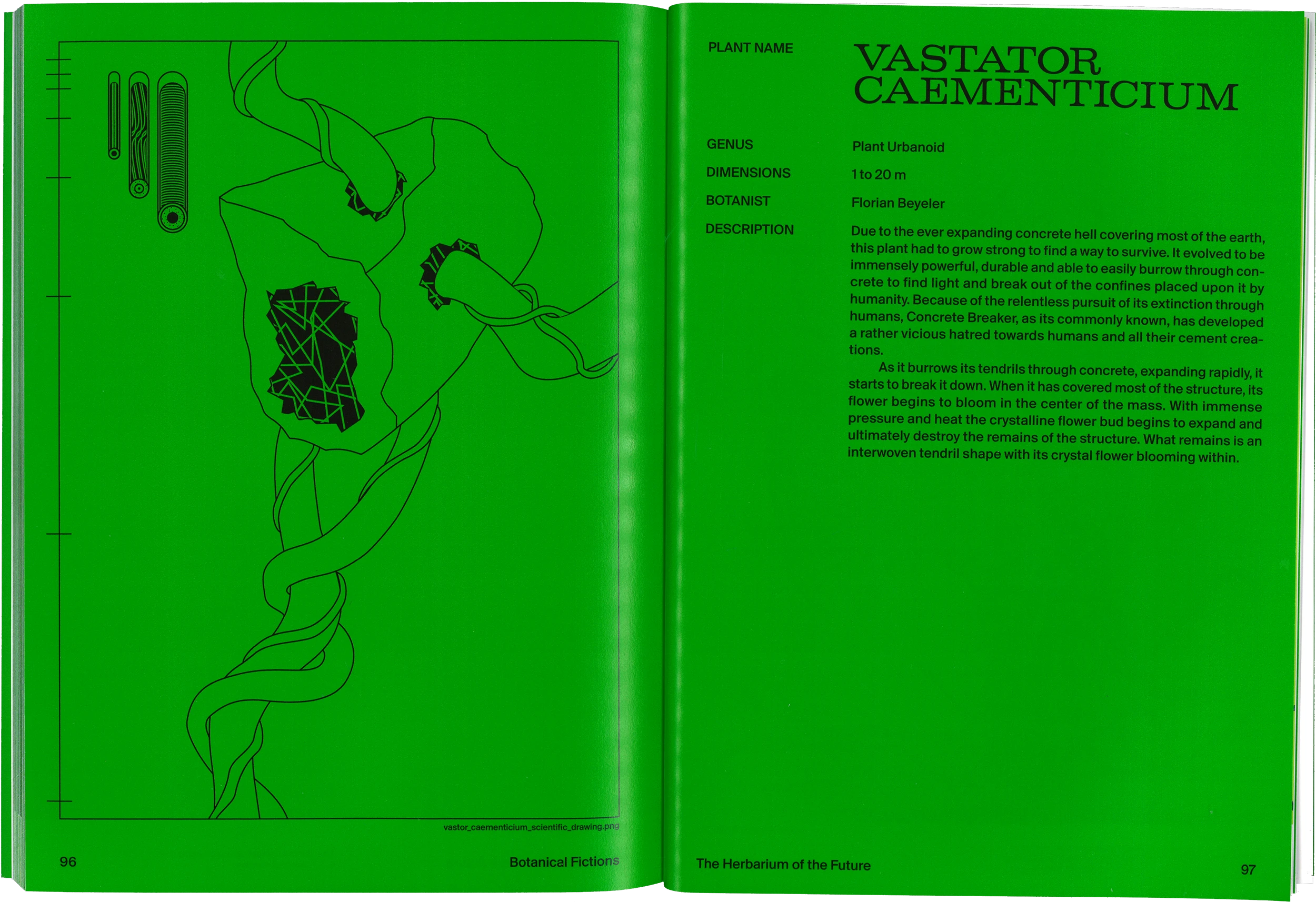 Wie sieht eine Pflanze aus, die in der Zukunft gedeihen wird? In welcher (Um)welt und unter welchen Bedingungen wird sie wachsen müssen? Als Antwort auf diese Fragen ist die Pflanze «Vastator Caementicium» entstanden. Ihre Ranken haben gelernt, in der von Beton überdeckten Welt, wurzeln zu fassen und durch ihre immense Kraft diese zu durchbrechen. In Zusammenarbeit mit Hannah Boldt, Charlotte Burckhardt, Rahel Marbet & Offshore Studio konnte die Publikation «Botanical Fictions» gestaltet werden, in der alle entstandenen Pflanzen aufgeführt sind.