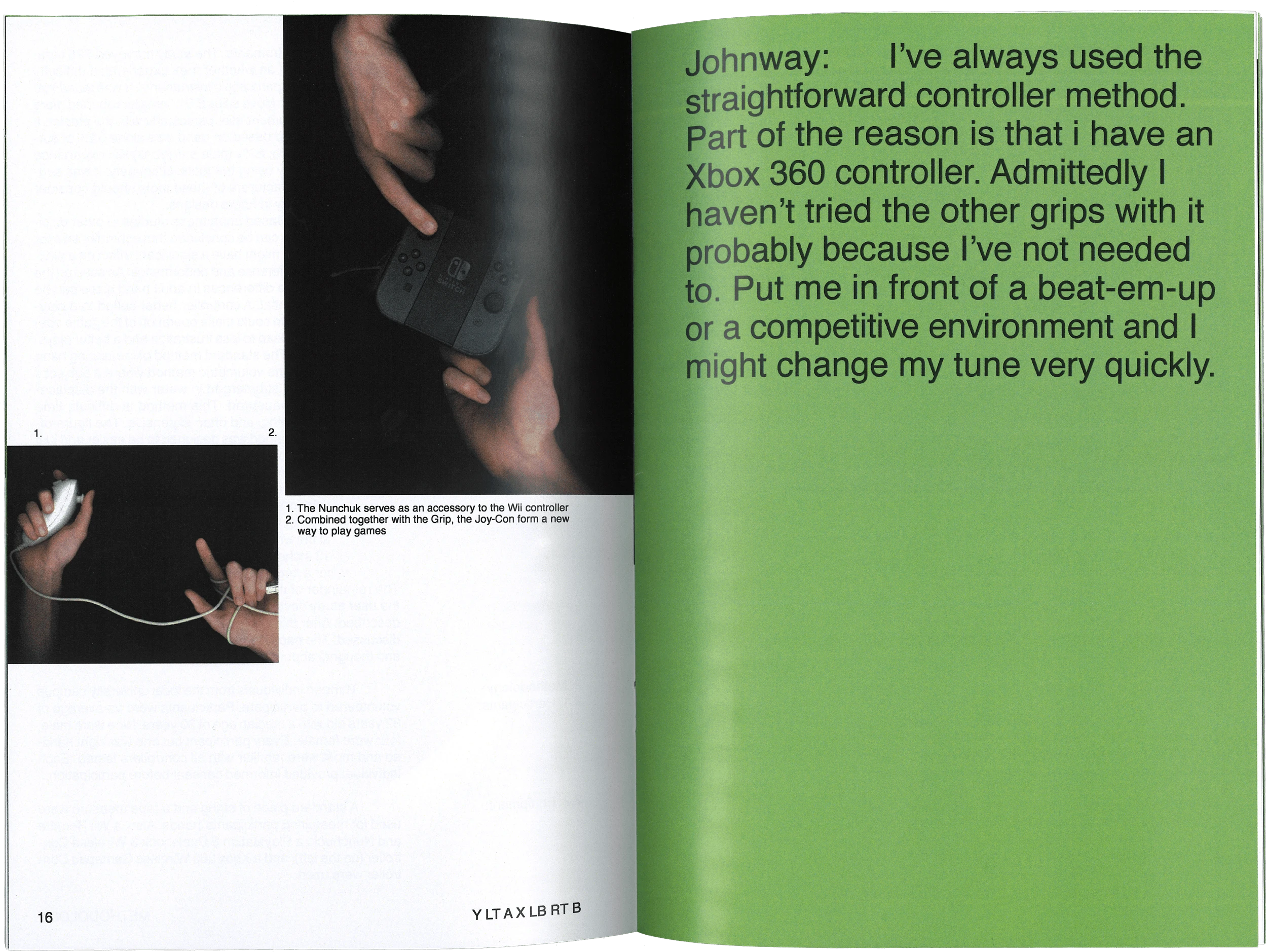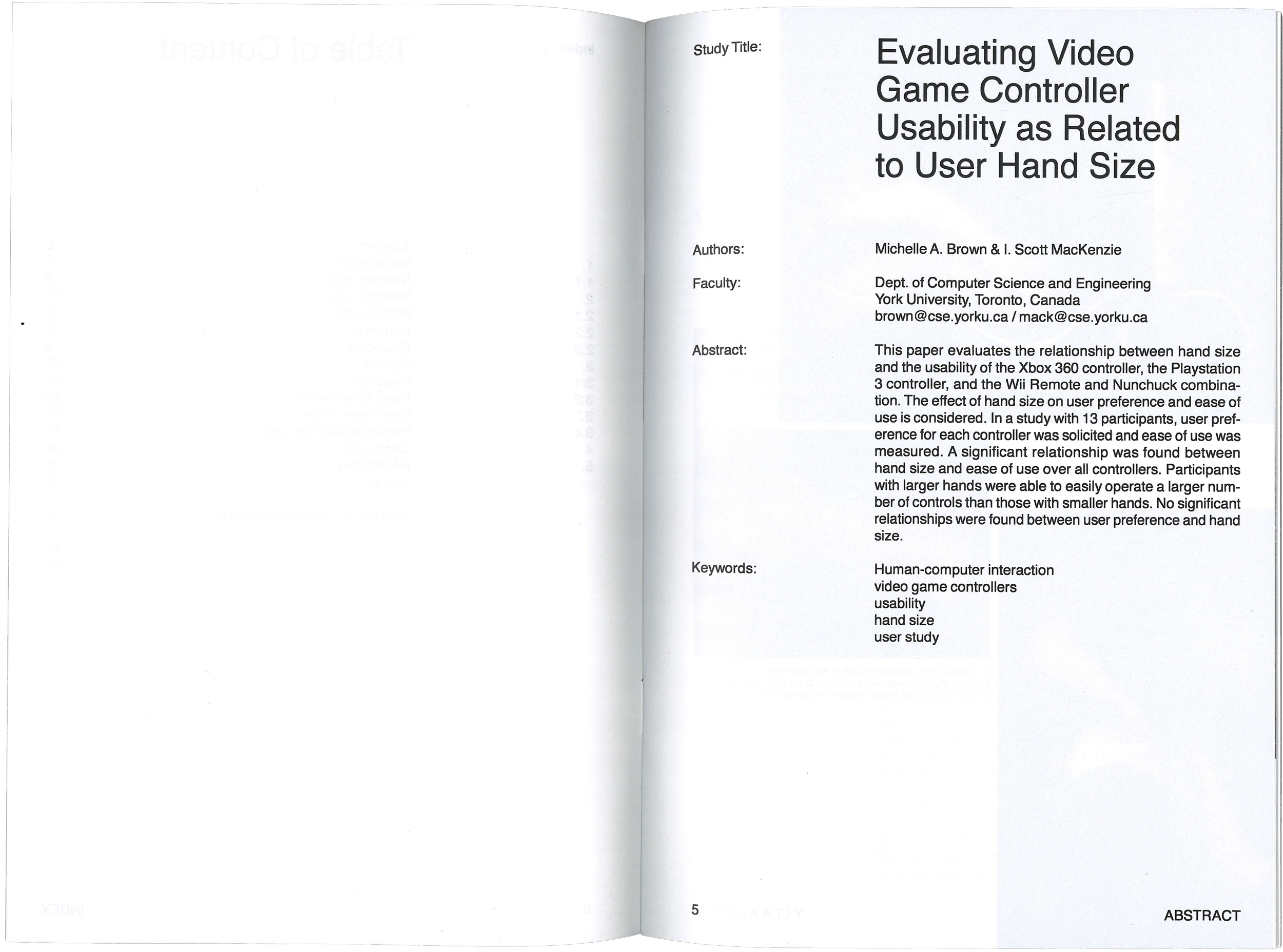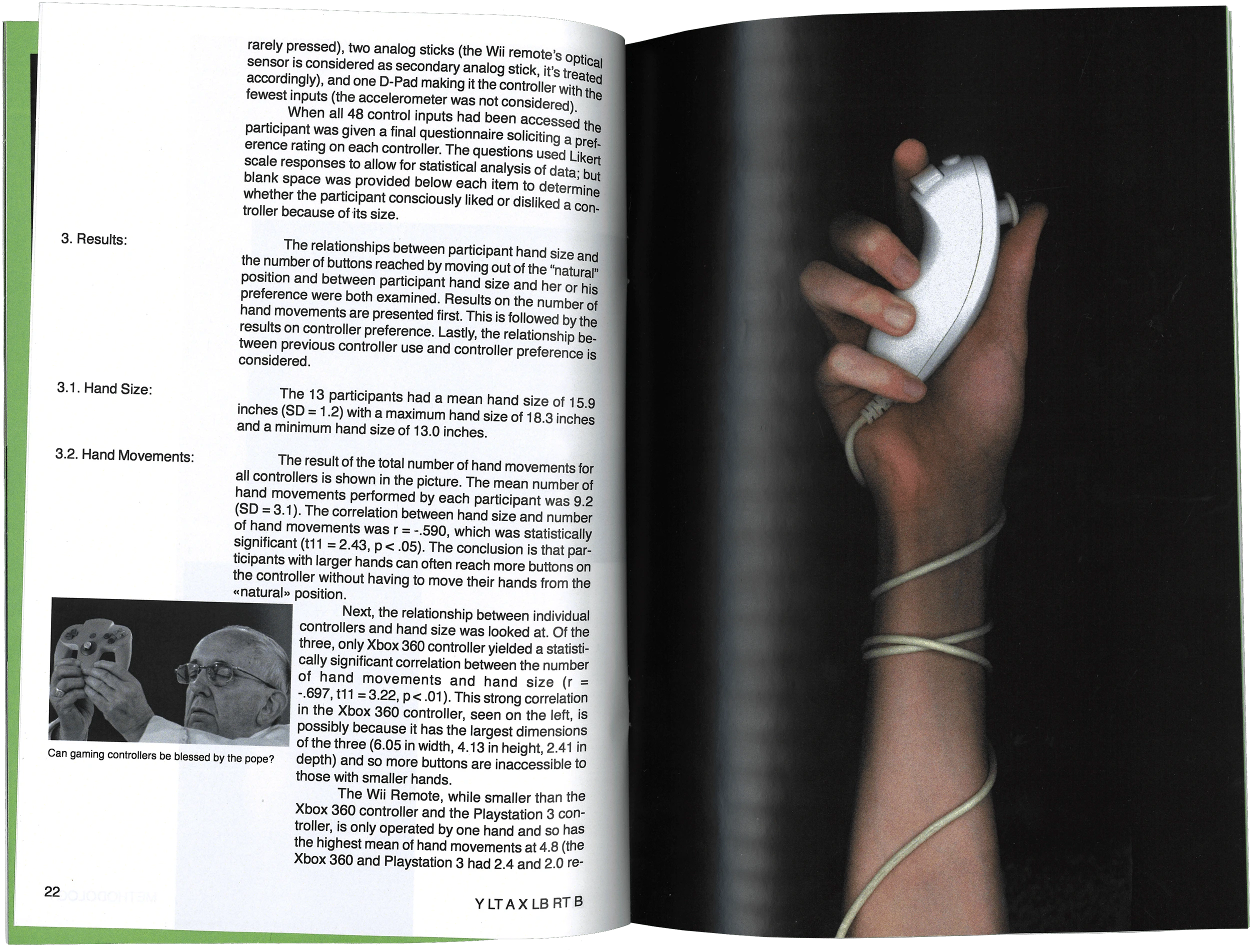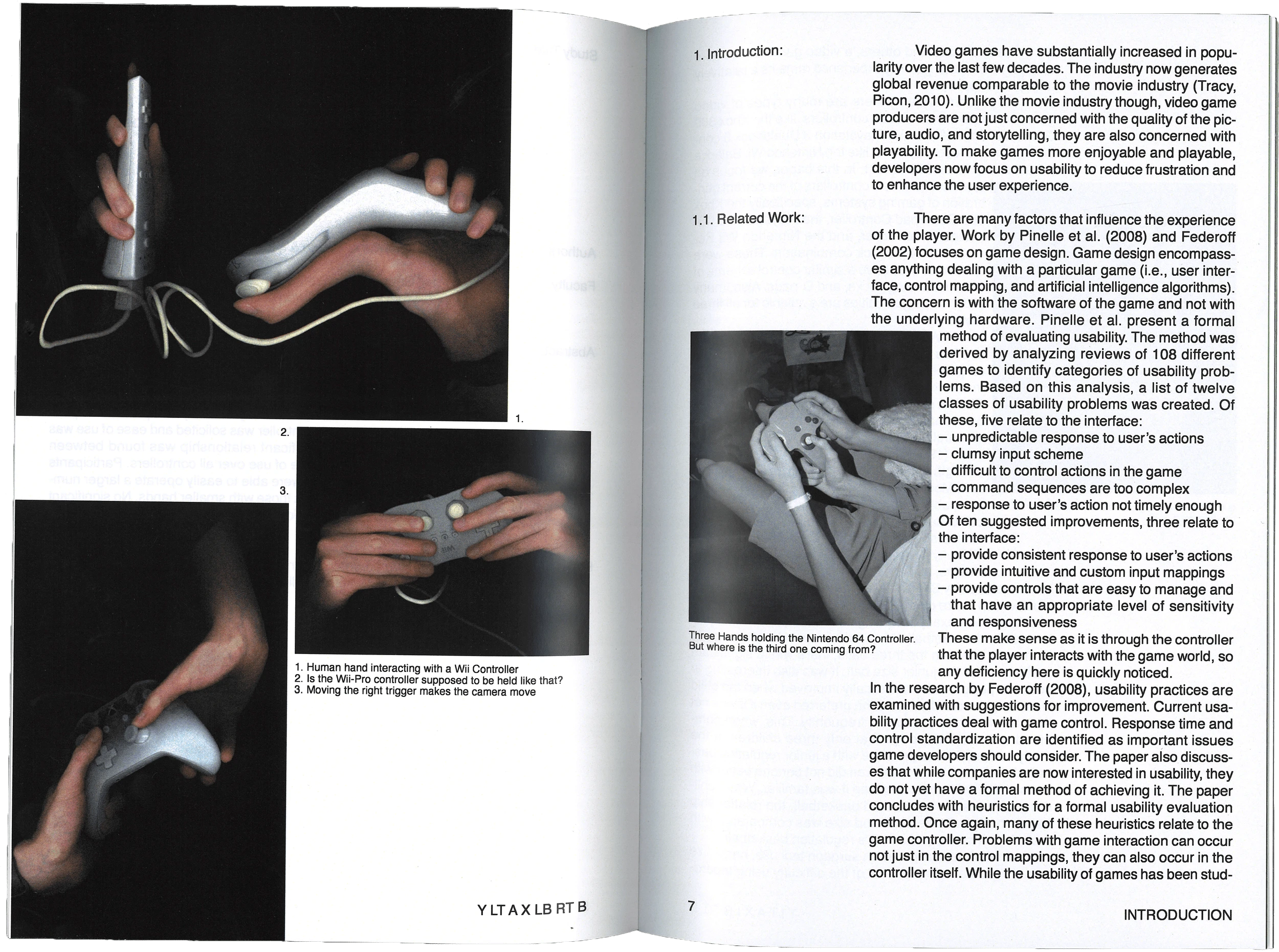 Editorial Design zu einem Wissenschaftlichen Artikel über das Thema Benutzerfreundlichkeit von Gaming-Controllern. Das an wissenschaftliche Publikationen angelehnte Layout wird von einer skurrilen und verzerrten Bildwelt von schwebenden Händen, die Controller halten, ergänzt.