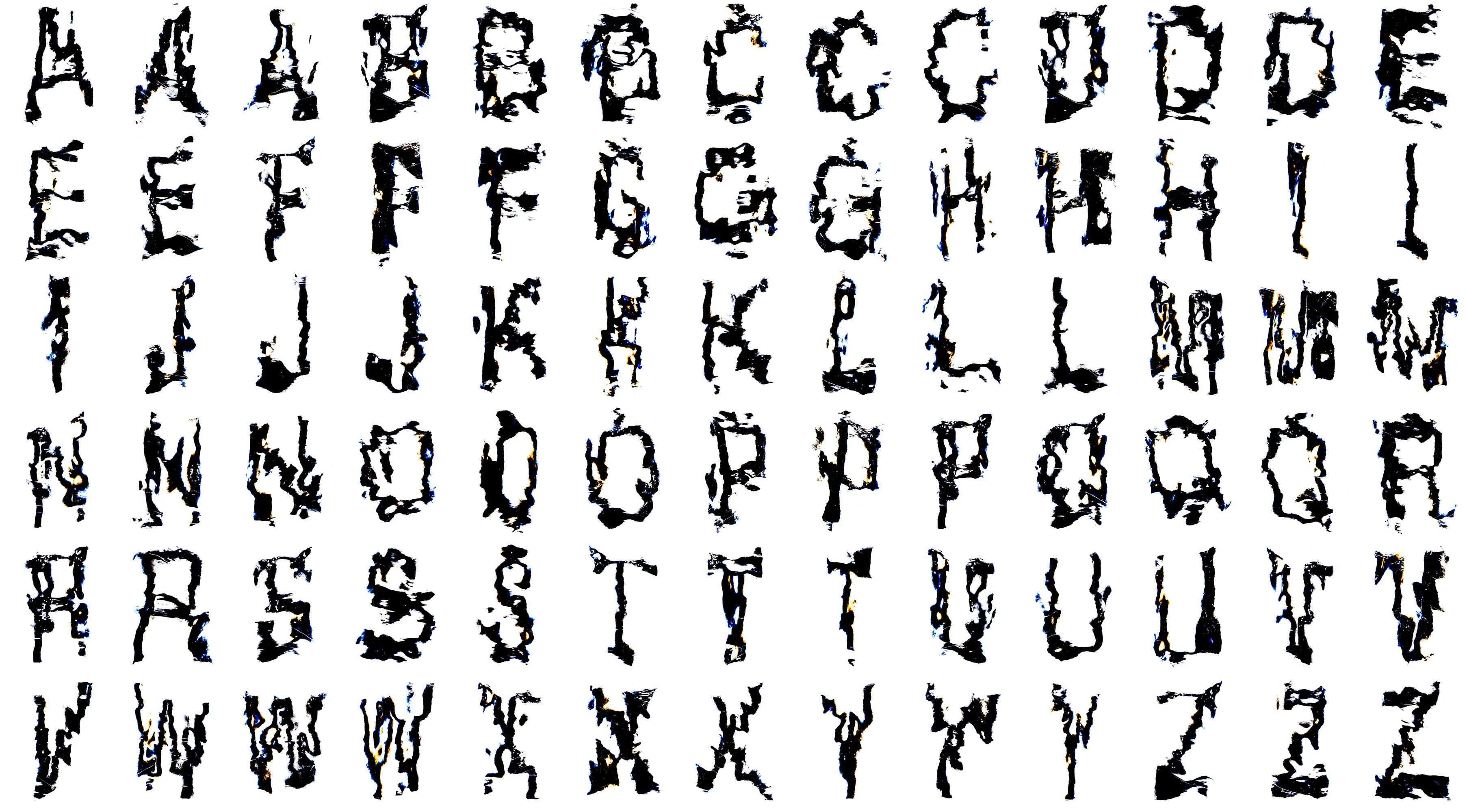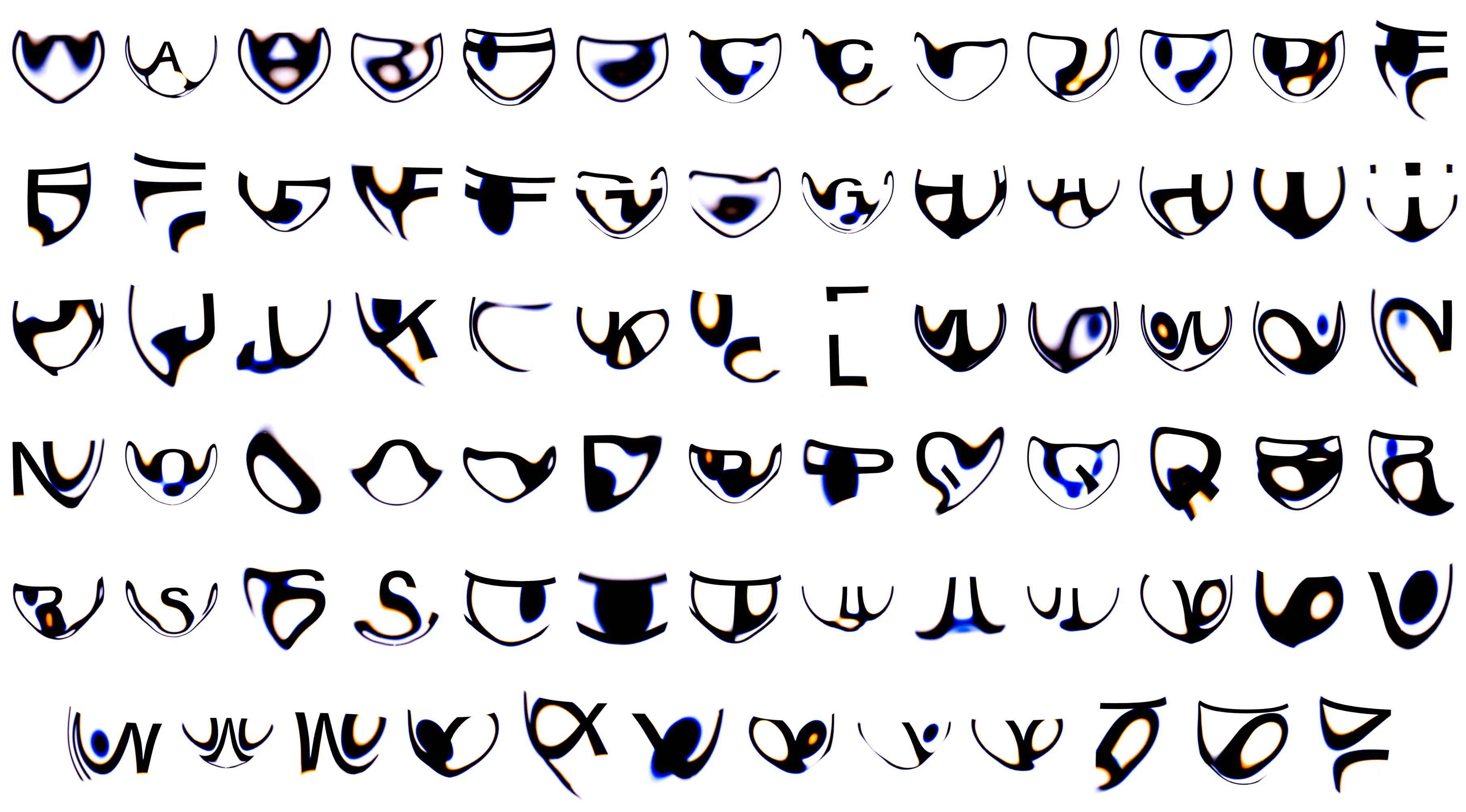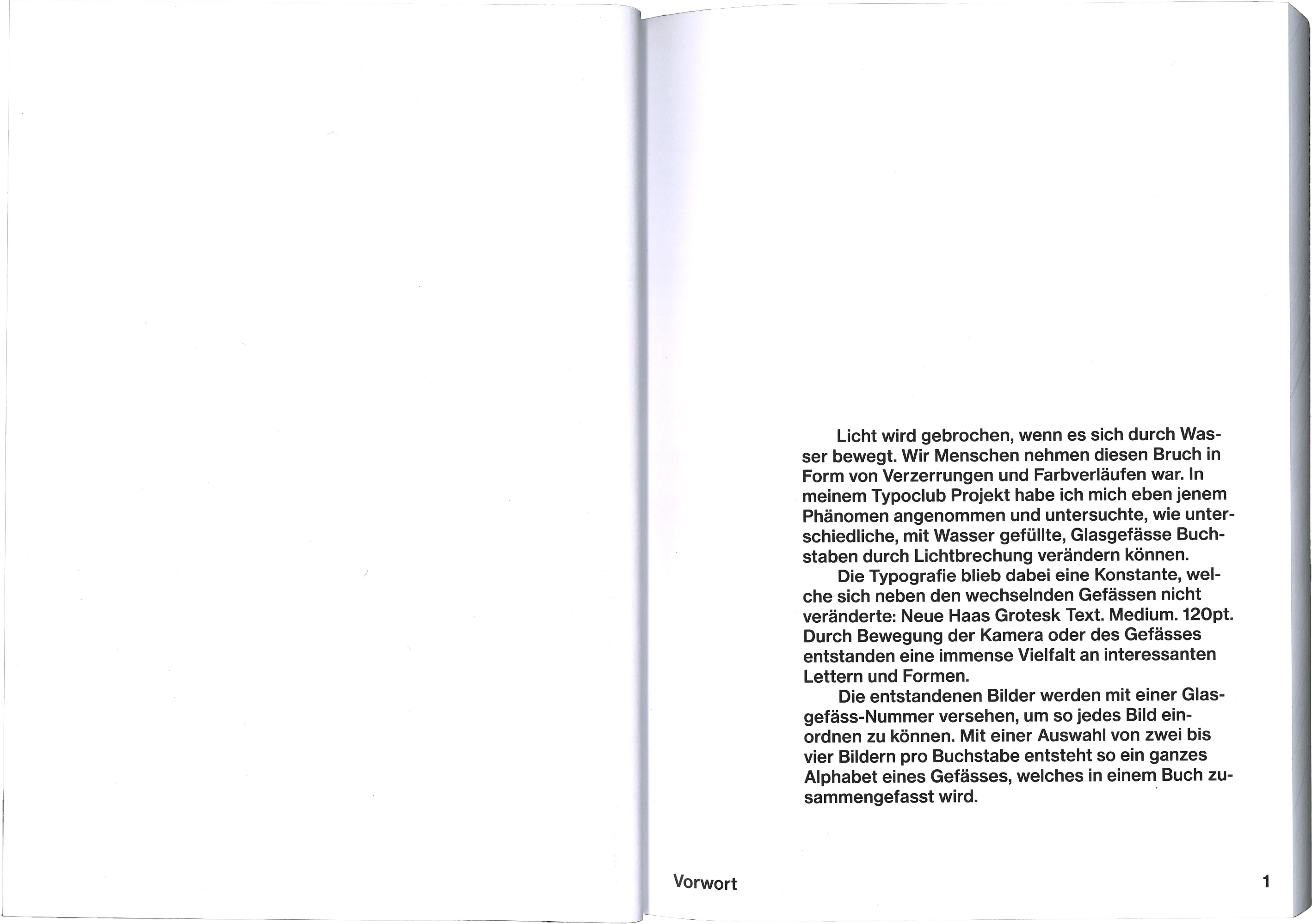 Licht das sich durch Wasser oder Glas bewegt wird gebrochen. Mithilfe des Fotografierens von Buchstaben durch mit Wasser gefüllten Glasgefässen, konnte dieses Phänomen zur Gestaltung von Typografie verwendet werden. Ein Zeichen spaltet sich dabei in eine Vielzahl unterschiedliche Varianten und Formen auf.