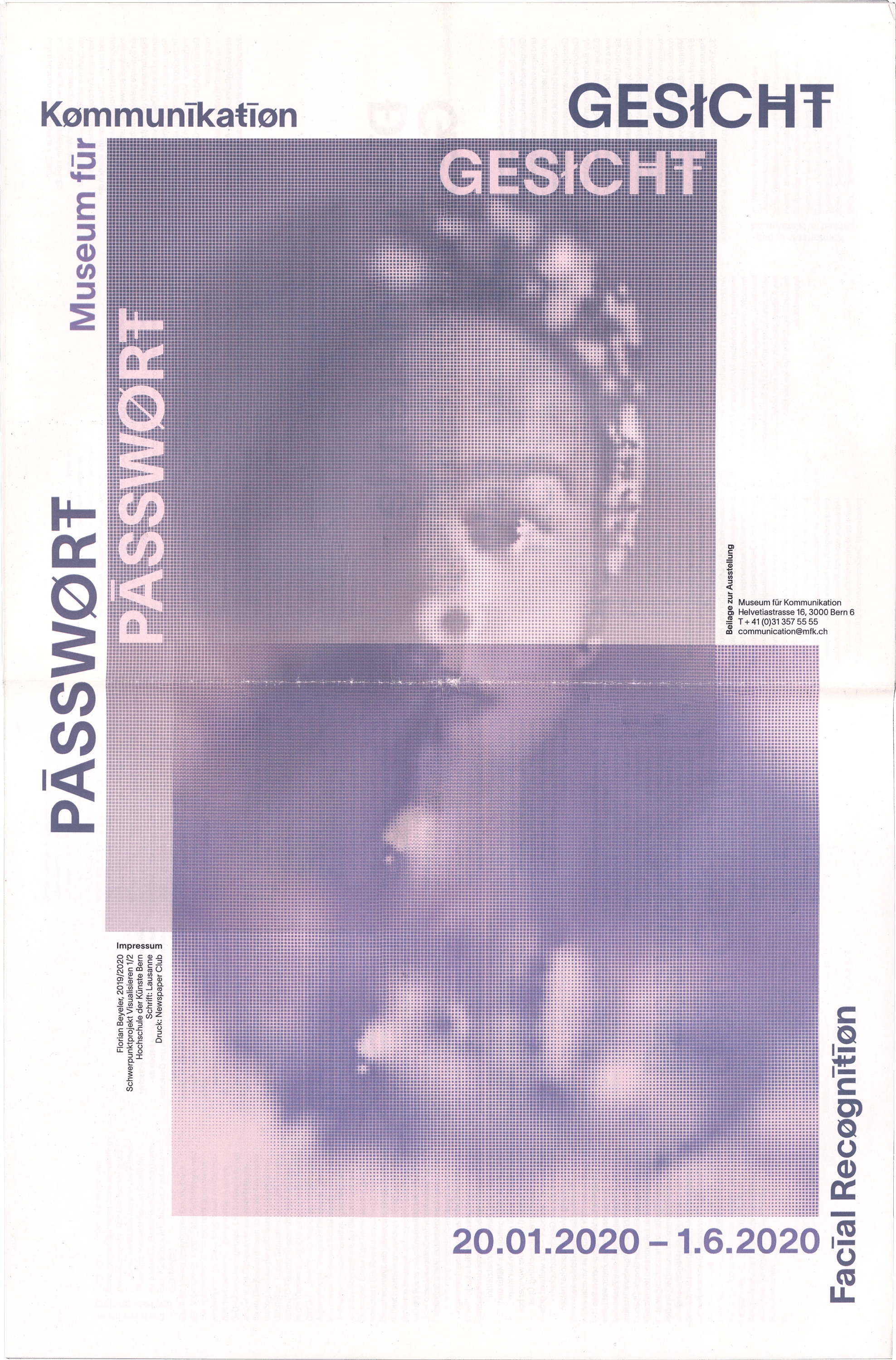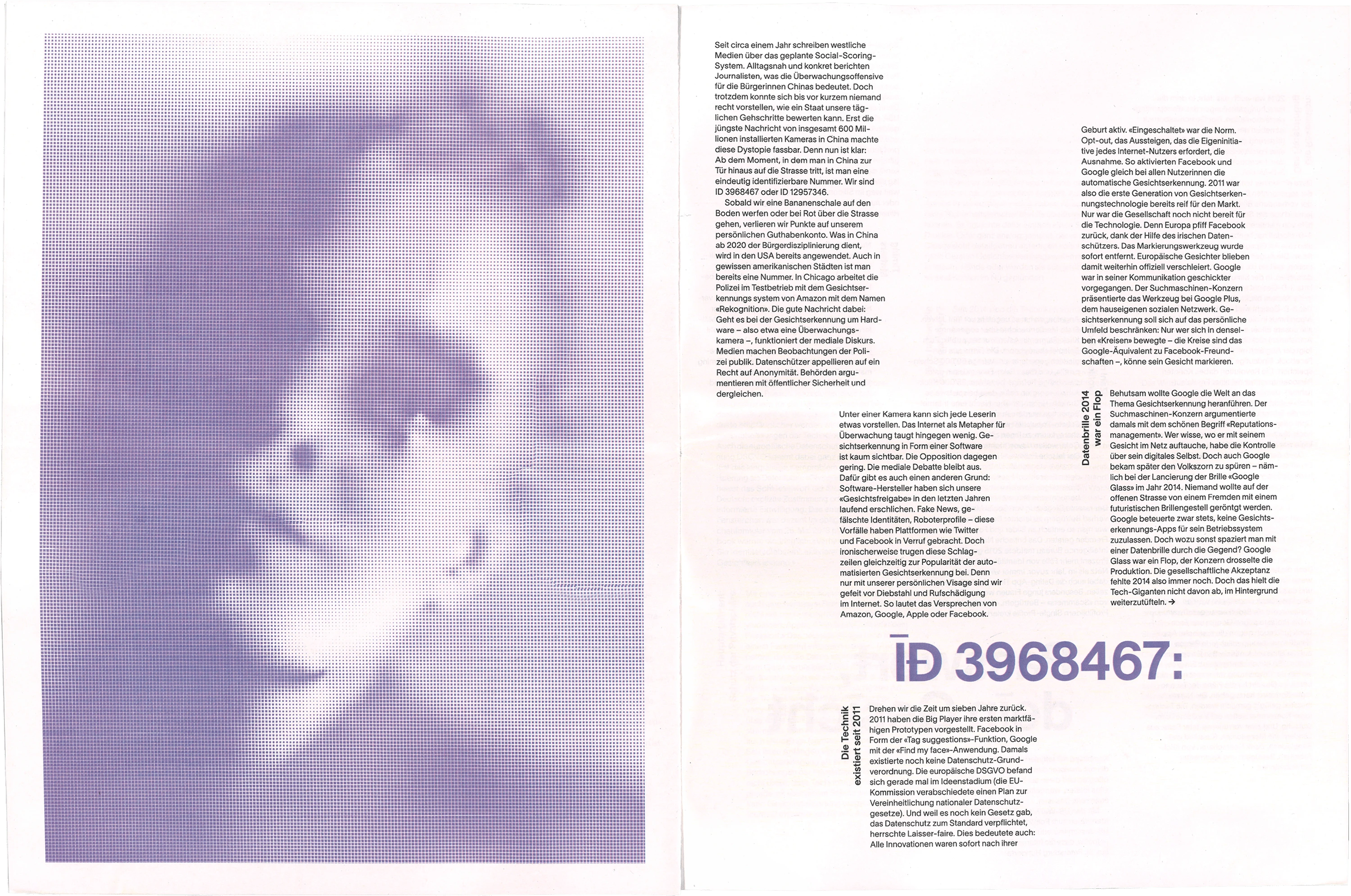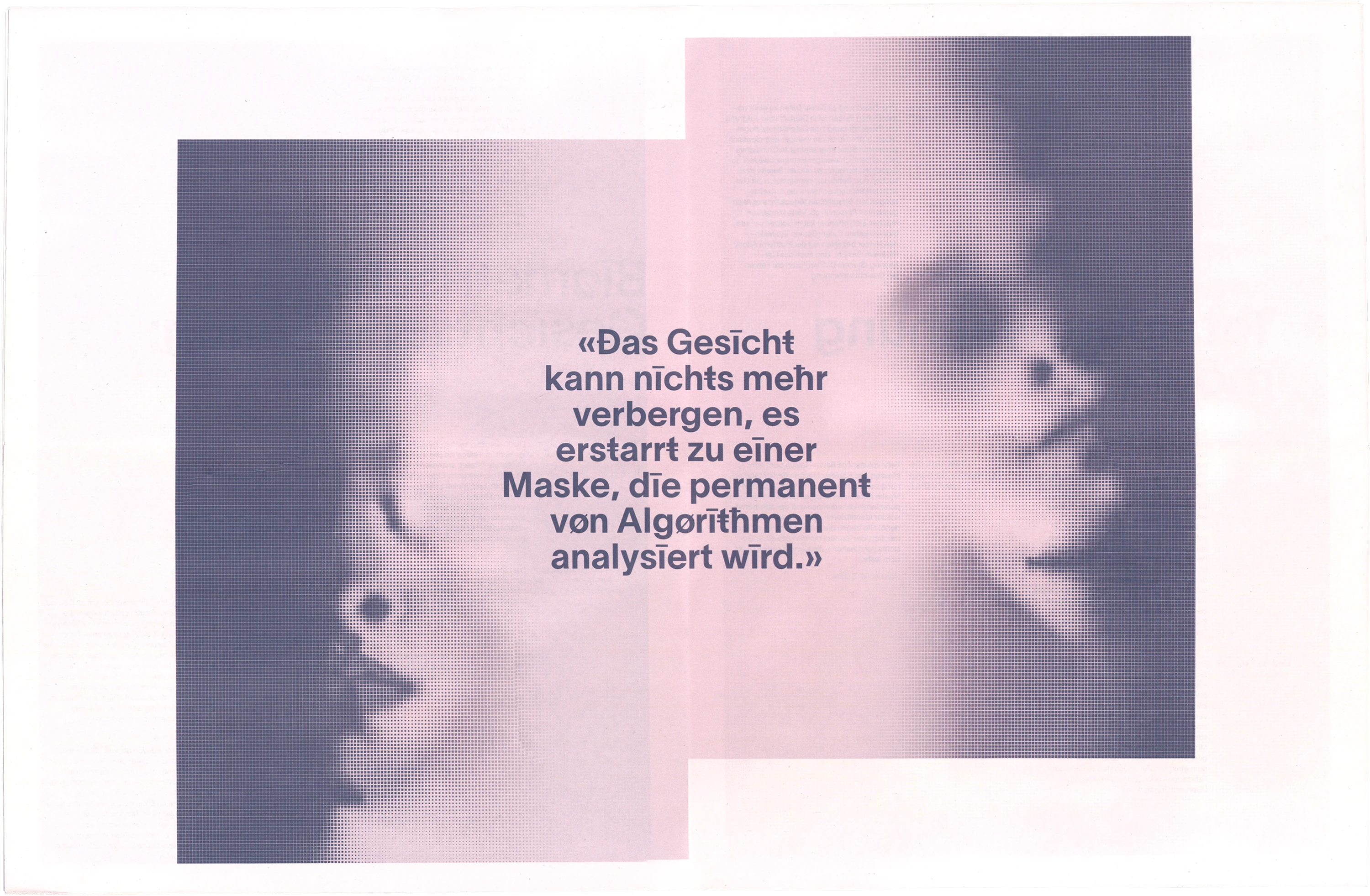 Die Zeitung zum Thema Gesichtserkennung behandelt den Aspekt der «digitalen Maske», welche erstellt wird, wenn ein Gesicht gescannt wird. Eine Interpretation dieser wird auf illustrativer Ebene in der Publikation mit gerasterten Gesichtern dargestellt. Die Typografie wird durch Sonderzeichen maskiert und stellt so ebenfalls eine Verbindung zur Thematik her.