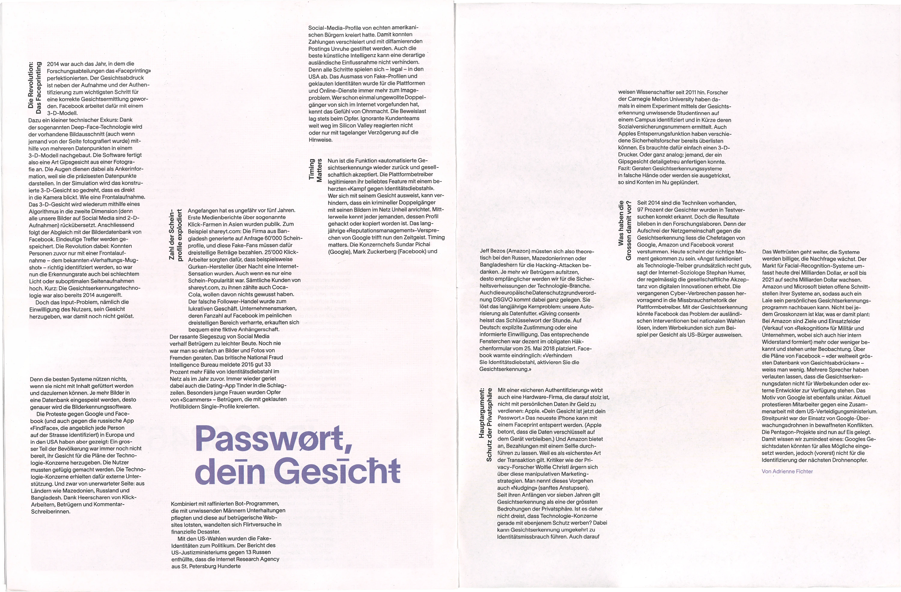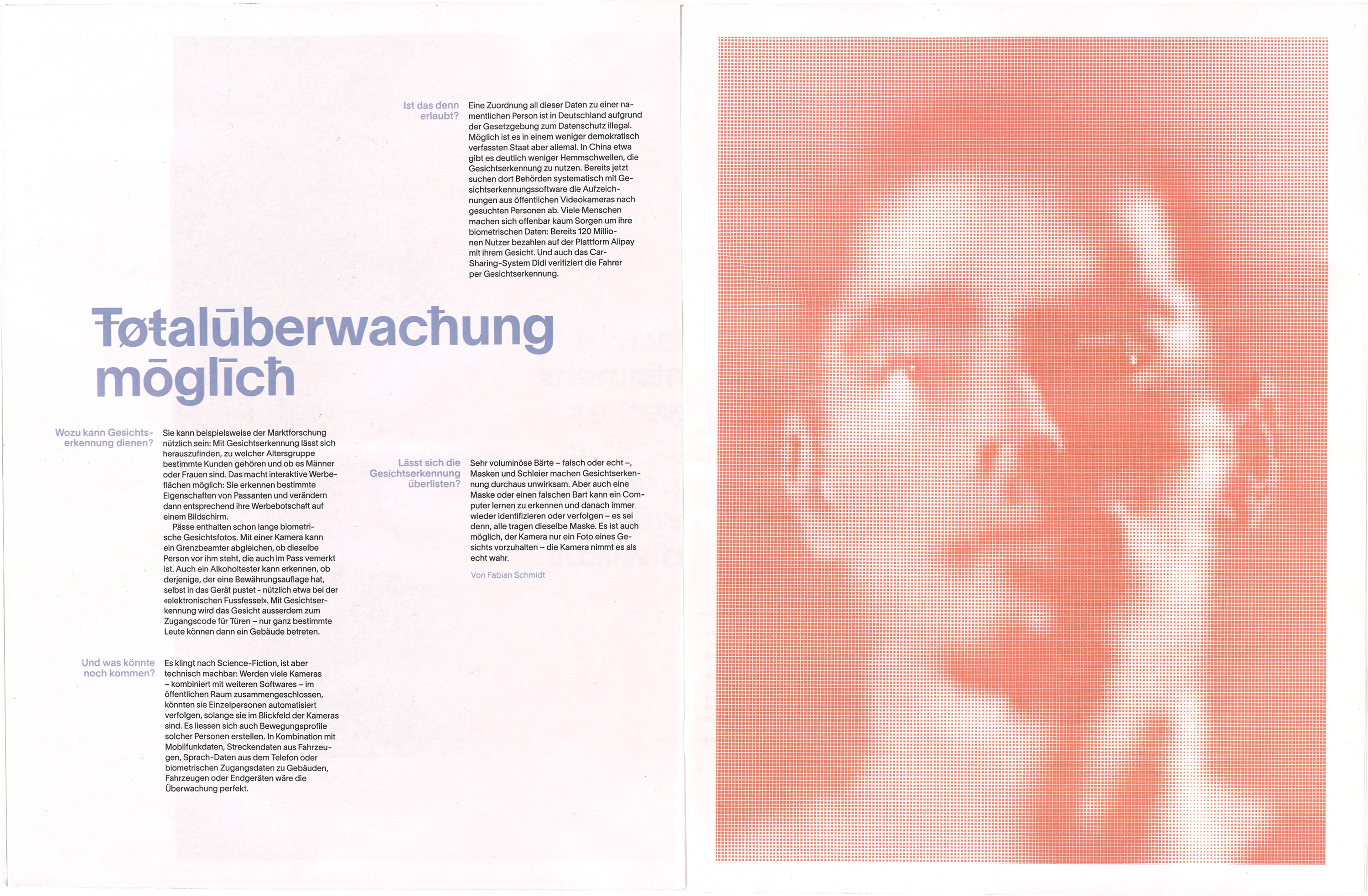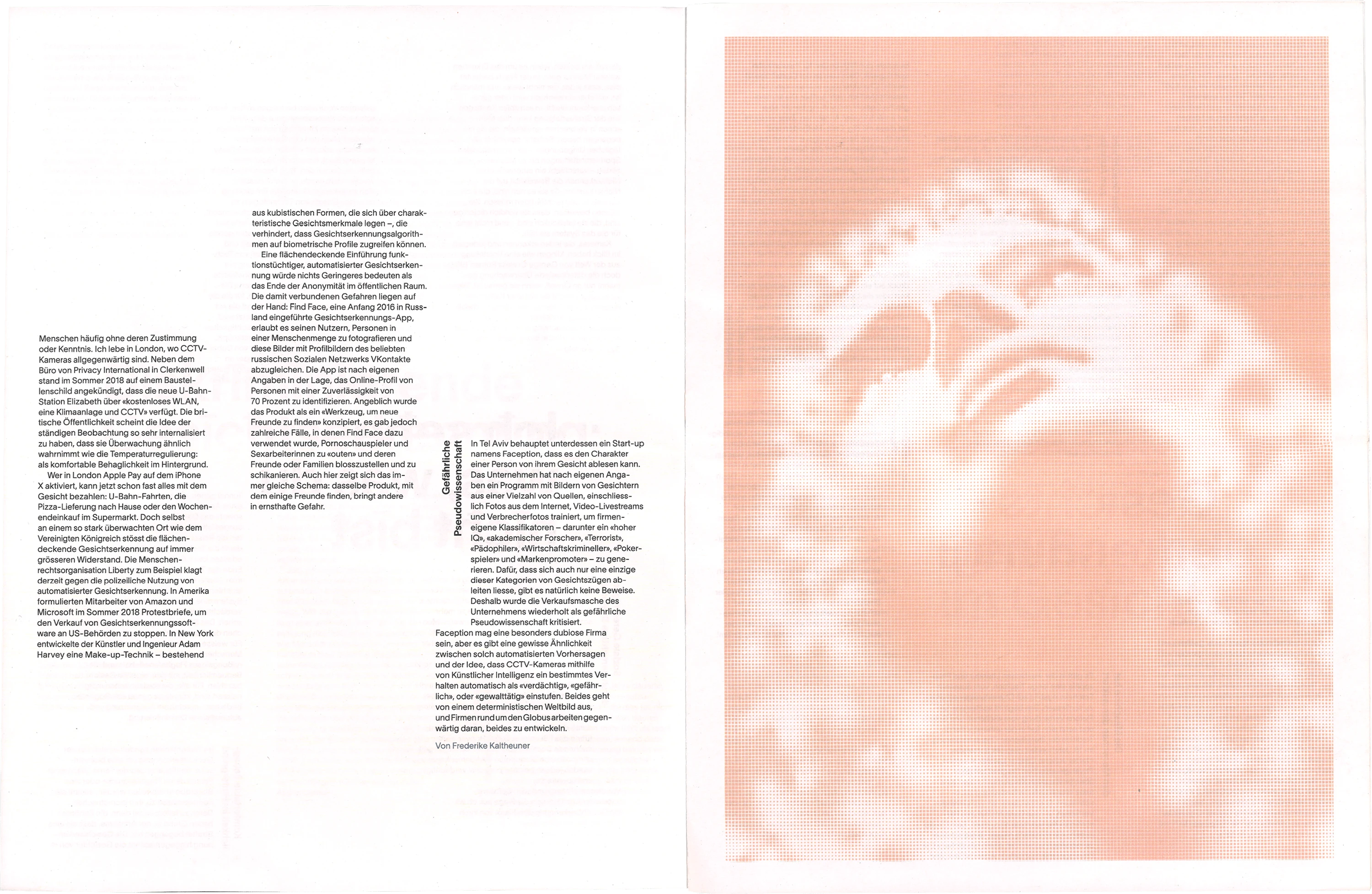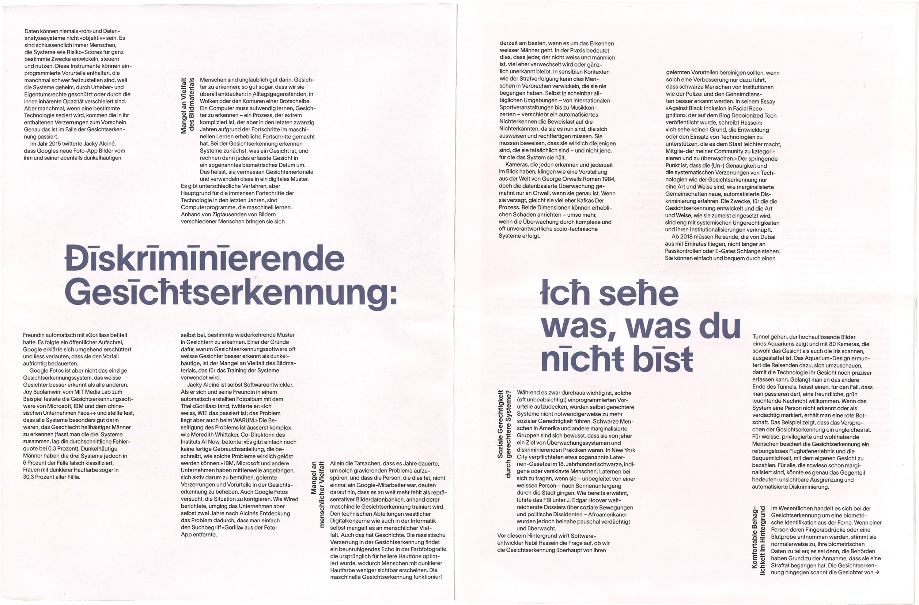 Die Zeitung zum Thema Gesichtserkennung behandelt den Aspekt der «digitalen Maske», welche erstellt wird, wenn ein Gesicht gescannt wird. Eine Interpretation dieser wird auf illustrativer Ebene in der Publikation mit gerasterten Gesichtern dargestellt. Die Typografie wird durch Sonderzeichen maskiert und stellt so ebenfalls eine Verbindung zur Thematik her.