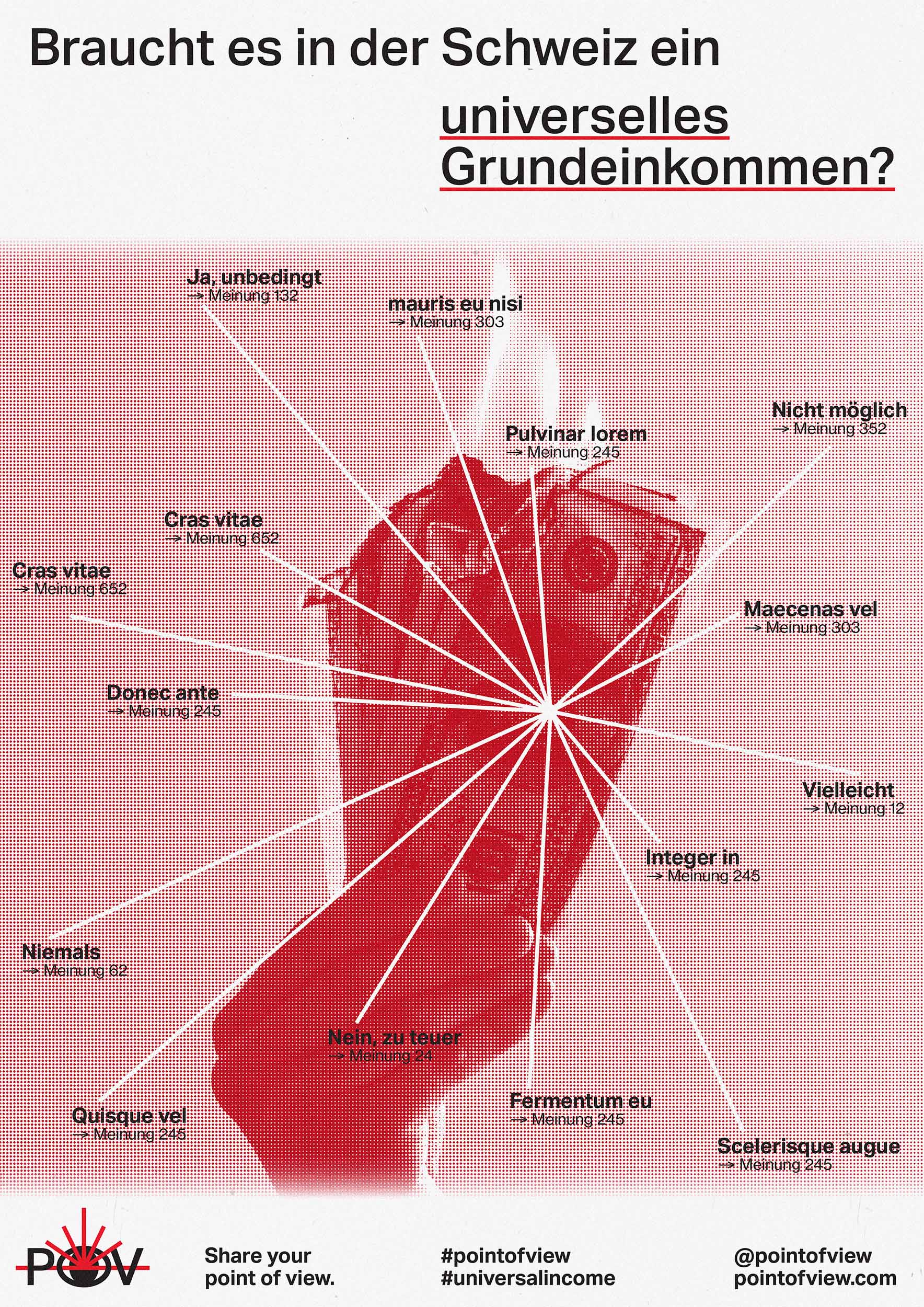 Das Branding Projekt für eine fiktive Wissens- und Meinungsaustausch-Plattform greift die Symbolik des Auges als Repräsentation des «Point of View» auf. Die Erweiterung des eigenen Horizonts, unterschiedliche Standpunkte und das Debattieren von Meinungen fliessen dabei alle in die Gestaltung der Identität ein.